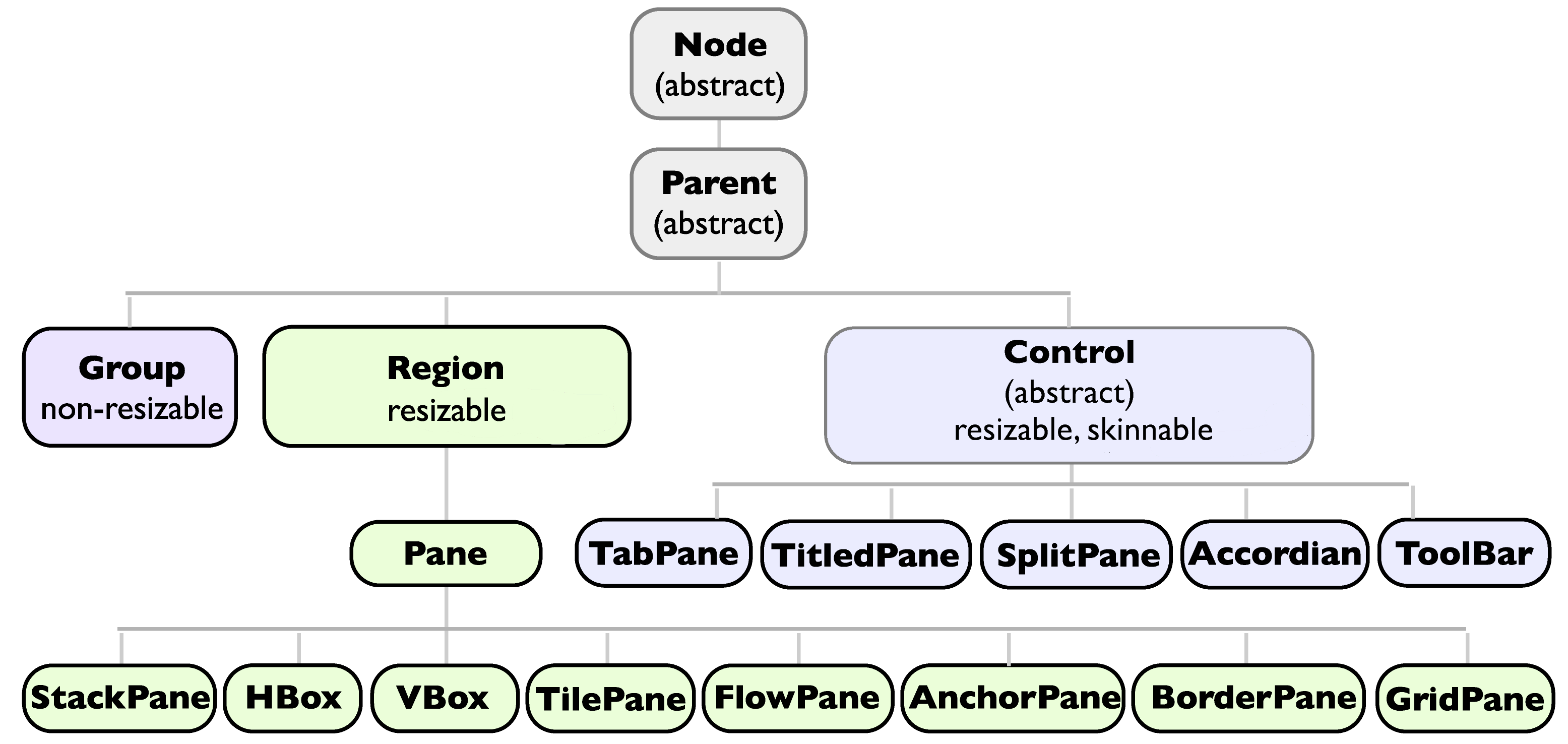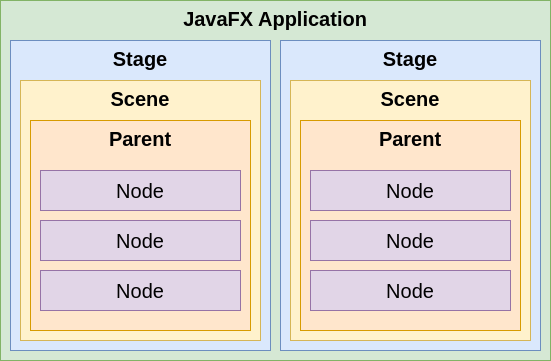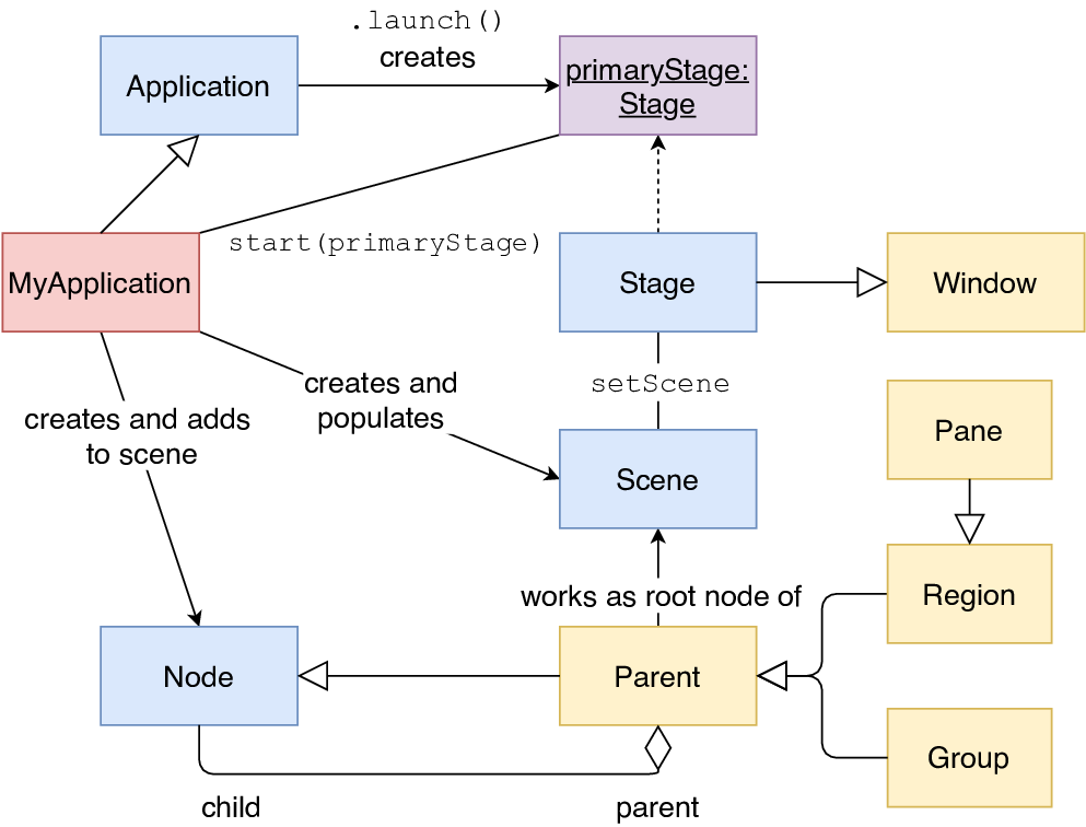 • javafx.scene.Scene contiene il cosiddetto scene graph, impostabile attraverso Scene#setRoot(Parent)